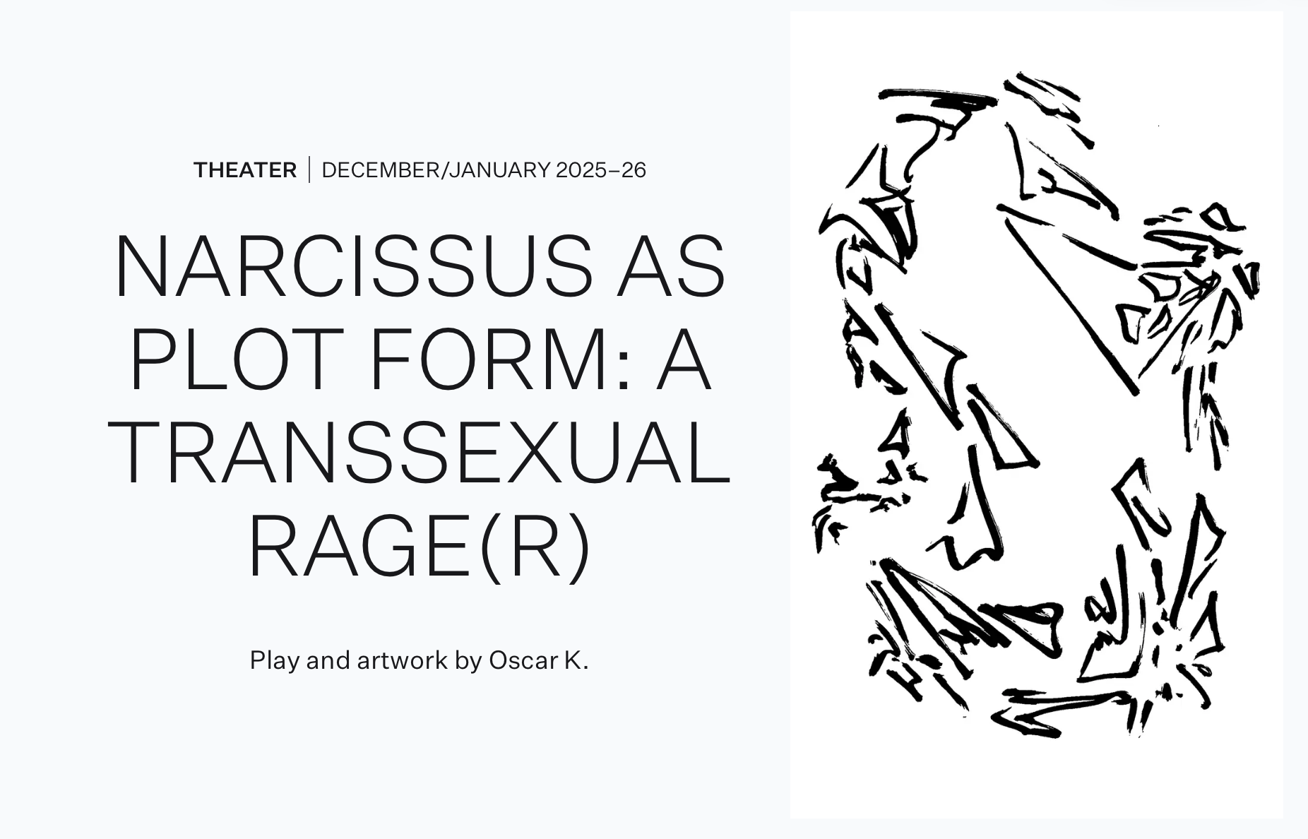NARCISSUS AS PLOT FORM: A TRANSSEXUAL RAGE(R) is a modern-day t4t4t love story that re-imagines Narcissus as a broke Bushwick transfag who ultimately breaks out of the doomed narrative of his namesake. Weaving together Ancient Greek gods and modern queer myth, the play is a meta-commentary on twink/doll solidarity, trans like transgression, and what it’s like to escape the prophecy put on your head and make your dreams come true. Make transition sexy again!